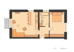Prostorný 1+kk apartmán o velikosti 29 m2 nabízí plně vybavenou kuchyň s mikrovlnou troubou, varnou deskou, varnou konvicí, kávovarem, lednicí a nádobím. V apartmánu je manželská postel a rozkládací gauč pro dvě osoby, stůl se 4 židlemi a televize. Nová moderní koupelna má sprchový kout. Apartmán má balkon.
