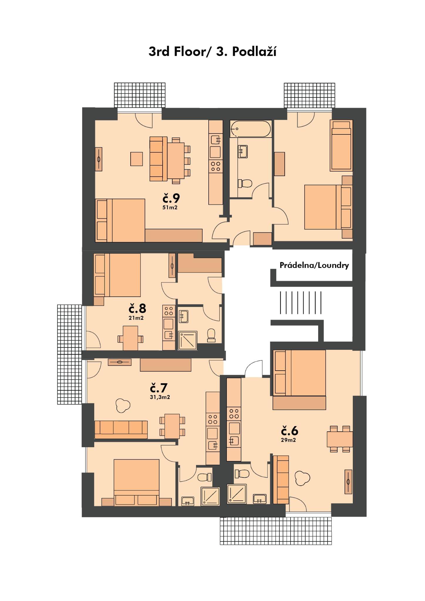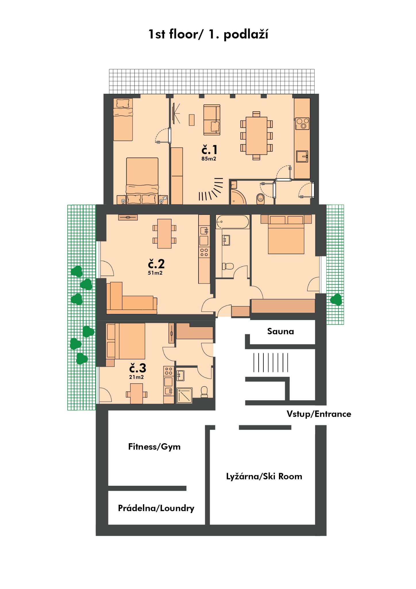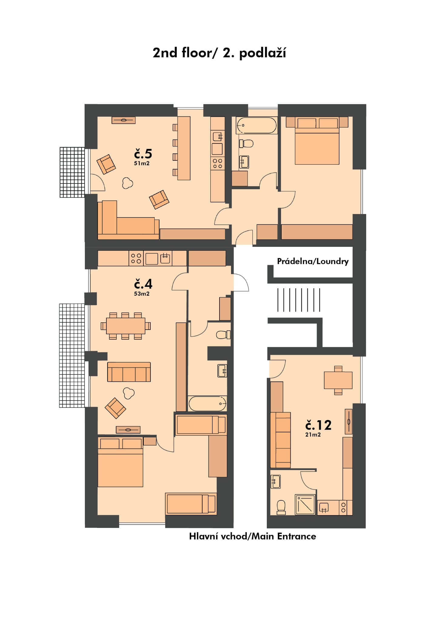 - 6x velký apartmán 2+kk z nichž některý apartmán má možnost ubytování pro 7-8 osob 51 m2 – 54 m2